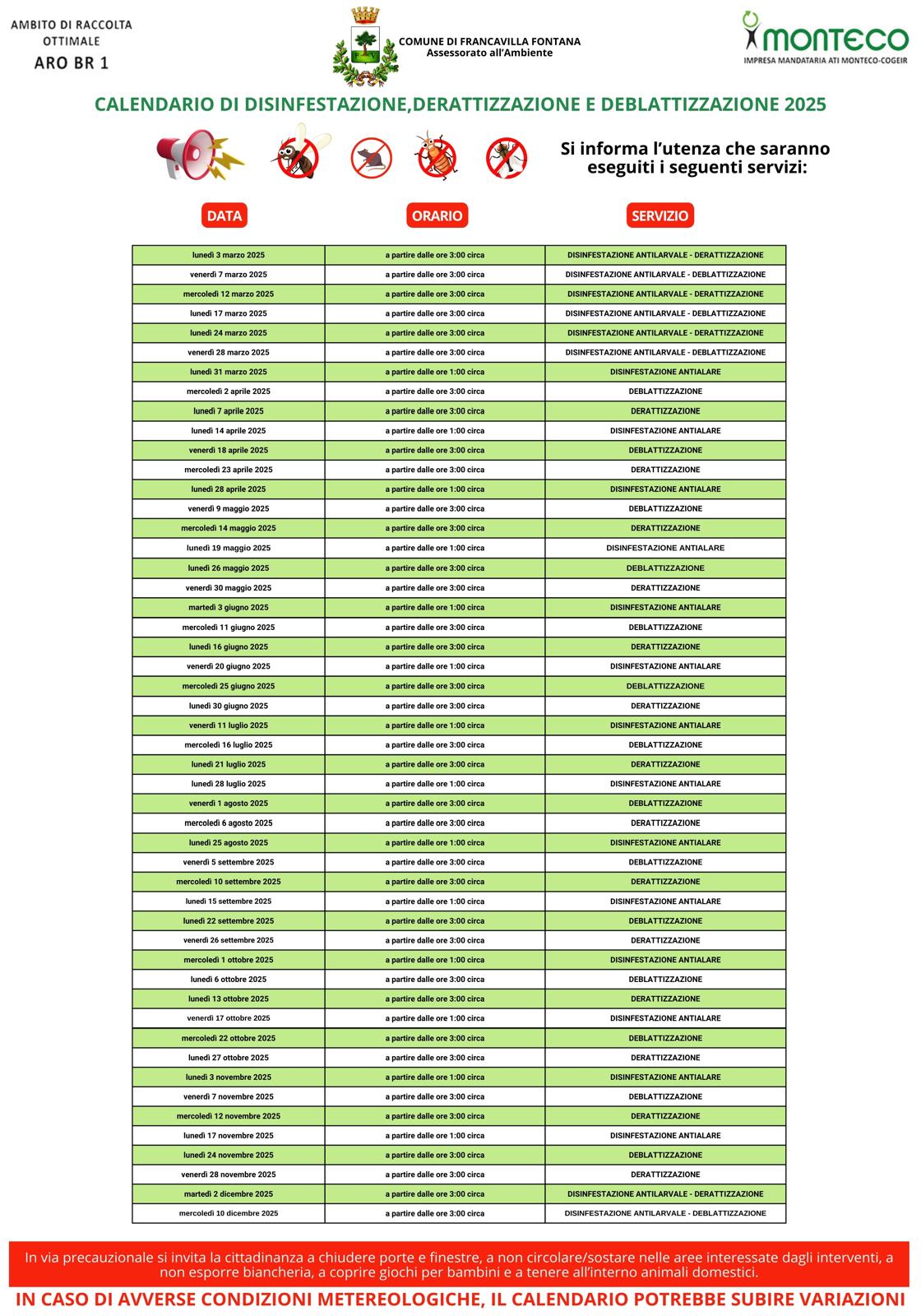 - lunedì 14 aprile ore 1.00 disinfestazione antialare
